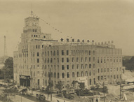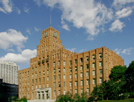 市政会館は、1929(昭和4)年10月19日、日比谷公園の南東の一角に日比谷公会堂とともに誕生しました。塔時計と茶褐色のタイル張りの外壁をもつクラシックな建物は、日比谷のシンボルとして親しまれています。