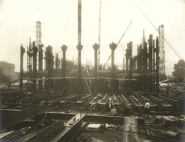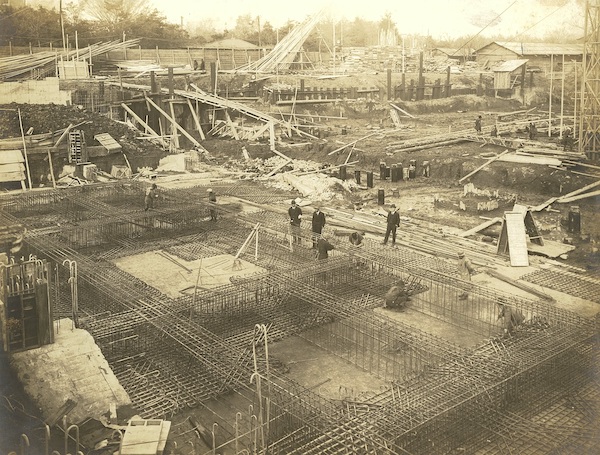 これらの問題により、建設工事が1年以上中断されましたが、1927年になり、ようやく基礎工事の認可、建物本体工事の認可が下り、その後は順調に工事が進みました。基礎を強固にするため、根切底に長さ約18メートルの松材杭2,200本を打ち込みました。この松材杭の上に鉄筋コンクリートで筏組をつくり、その上に鉄骨鉄筋コンクリート造で建設されました。