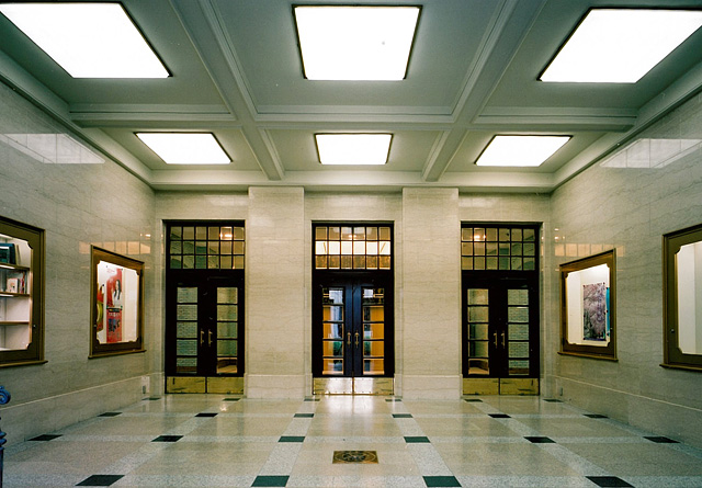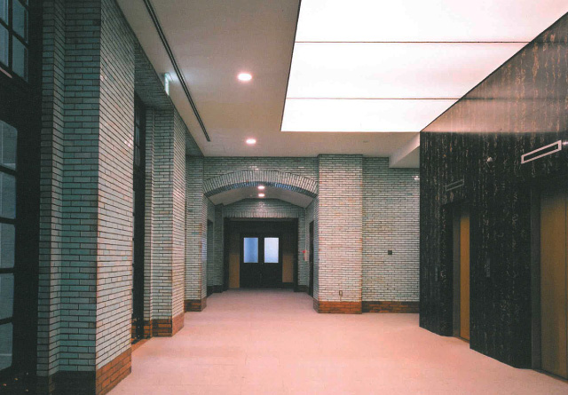 天井高4.5メートルのエントランスホールは、床面は御影石、壁面は大理石で覆われています。